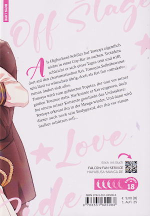 ![]() © 2023 Kamome Oshima HayabusaDer Oberschüler Tomoya Nakazaki ist schwul und sehr schüchtern. Eines Tages benutzt ihn seine Schwester, eine Visagistin, als Model für ihre neue Schminke. Durch das geschminkte Gesicht fühlt sich Tomoya gleich reifer und erwachsener. So schleicht er sich heimlich in die Schwulenbar DEEP ONEs, in der Hoffnung, jemanden zu finden, mit dem er Sex ausprobieren kann. Tomoya will zwar nicht auffallen, aber er wird an der Tür von dem riesigen Kei überrascht, der ihn gleich zur Bar schiebt. Er ist nervös, aber die Leute an der Bar reden normal mit ihm. Aber sie bemerken, wie er Kei ständig anstarrt. Sie rufen Kei an die Bar und erklären ihm, dass sich Tomoya in ihn verguckt hat. Kei erklärt sich bereit, mit ihm ins Bett zu gehen. So landen sie bei Kei im Bett. Tomoya freut sich auf seinen ersten Sex und freut sich, dass Kei ihm dabei hilft. Doch dann klingelt Tomoyas Handy und Kei erkennt, dass er nur ein Schüler ist. Worauf Kei Tomoya aus dem Haus wirft. Aber immerhin sagt er ihm, dass er ihn attraktiv findet. Kurz darauf erzählt Tomoyas Schwester, dass sie sein Foto, das sie von ihm nach dem Schminken gemacht hat, an ein Talentwettbewerb geschickt hat. Weil Kei Tomoya attraktiv genannt hat, hat er genug Selbstvertrauen bekommen, um den Wettbewerb zu gewinnen und der Star der Band INCITE zu werden. So ist es auch die Erinnerung an Kei, die ihn den Drill und den Stress überstehen lässt. Bei einem seiner Auftritte entdeckt Tomoya Kei allerdings im Publikum. Tomoya hat aber eine andere Haarfarbe und einen Künstlernamen. Doch Kei scheint sich in sein neues Ich verliebt zu haben. Von nun an sieht Tomoya Kei oft in den Konzerten. Tomoya fühlt sich dadurch beruhigt. Eines Tages wird Tomoya nach der Arbeit von einer Frau gestalkt. Weil sie ihn schließlich bedroht, bekommt er einen Leibwächter, der niemand anderes als Kei ist. Von nun an weicht Kei Tomoya nicht mehr von der Seite. Er passt gut auf ihn auf. Aber Tomoya ist sich unsicher, ob Kei ihn erkannt hat. Der Manga erzählt die Geschichte eines schwulen Schülers, der das Glück hat, zu einem Star aufzusteigen. Doch am Anfang und an Ende trifft er auf den großen Kei. Und er ist unsicher, wie er ihm begegnen soll. Grafisch ist der Manga in Ordnung. Die Charaktere sind sauber und unterschiedlich gestaltet. Die Frisuren ähneln sich allerdings etwas und unterscheiden sich hauptsächlich durch die Haarfarbe. Aber die Gesichter sind fein und detailliert gezeichnet. So sind die Gefühle gut getroffen. Als Kleidung werden Freizeitkleidung und Anzüge getragen. Diese sind gut gestaltet und mit den Falten gut den verschiedenen Posen angepasst. Nackt werden die Charaktere etwas übertrieben dargestellt. Die erotischen Szenen sind leicht zensiert. Es werden nur wenige Hintergründe gezeigt, die detailliert gezeichnet sind. |
