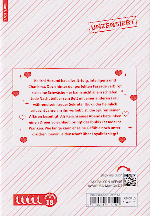 © 2023 Senmu Sakishita HayabusaKeiichi Hozumi ist jung und erfolgreich. Als er verkündet, dass er eine eigene Firma gründen will, bittet ihn sein enger Freund aus Studientagen, Ibuki Hiiragi, ihn mitzunehmen. Jahre später ist Ibuki der persönliche Sekretär von Keiichi. Neben den Aufgaben im Büro, die er perfekt erfüllt, muss er auch dafür sorgen, dass Keiichi, dessen Wohnung an das Büro grenzt, morgens aus dem Bett kommt. Das ist schwierig, denn Keiichi ist nicht nur ein Langschläfer, sondern er trinkt abends viel und kann ohne Begleitung nicht einschlafen. So muss Ibuki auch Keiichis Frauen aus der Wohnung werfen. Dennoch ist Keiichi mit Ibukis Arbeit sehr zufrieden. Allerdings übermittelt der auch die Nachricht von Keiichis Mutter, dass er endlich heiraten soll. Keiichi ist frustriert, denn trotz vieler Frauenbekanntschaften hat er noch nicht die passende Frau gefunden. Aus einer Laune heraus, lädt er Ibuki ein, einen Dreier zu veranstalten. Als Ibuki abends in den Sexclub kommt, in dem Keiichi seine Frauen aufreißt, hat der zwar schon eine willige Frau gefunden, ist aber auch schon komplett betrunken. So schnappt sich Ibuki Keiichi trotz Protesten und schleppt ihn nach Hause. Da Keiichi aber nicht alleine schlafen kann, bietet ihm Ibuki an, mit ihm Sex zu haben. Denn seit dem Studium ist er heimlich in ihn verliebt. Betrunken, wie er ist, meint Keiichi, dass er am besten Ibuki heiraten sollte, da der sich so gut um ihn kümmert. Am nächsten Morgen verkündet Ibuki, dass Keiichi von nun an keine Frauenbekanntschaften mehr suchen muss, da ab nun er nachts neben Keiichi schlafen wird. Der Manga erzählt die einfache Geschichte zweier Kommilitonen, die so eng befreundet sind, dass der eine sich um alle privaten Angelegenheiten des anderen kümmern kann. Doch dann wird aus ihrer freundschaftlichen Beziehung mehr und das erotische Zusammenleben beginnt. Grafisch ist der Manga eher nur durchschnittlich. Die Charaktere unterscheiden sich hauptsächlich durch die Größe und Haarfarbe und sind nur einfach dargestellt. Die Haare sind strubbelig, wobei Ibuki und Keiichi leicht unterschiedliche Frisuren haben. Die Gesichter sind einfach gezeichnet, weshalb die Emotionen auch nur übertrieben gezeigt werden. Als Kleidung tragen die Charaktere neben Geschäftsanzügen nur einfache Shirts und Pullover. Diese sind allerdings mit den Falten und Schattierungen gut den unterschiedlichen Posen angepasst. Nackt zeigen sie muskulöse Körper, die aber nicht übertrieben wirken. Die erotischen Szenen sind vielfältig und nicht zensiert. Gegenstände und Hintergründe sind sauber, aber auch eher nur detailarm gezeichnet. |