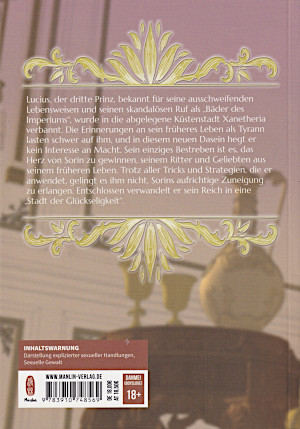 © 2024 J. N. ManlinIn seinem früheren Leben war der Leibritter Sorin der Scharfrichter des Herrschers, der sich in ihn verliebt hatte. Da der Blick des Scharfrichters Unglück verheißt, hat er aber den Herrscher nie angeblickt. So ließ sich der Herrscher selber hinrichten, um einen Blick des Scharfrichters zu erhaschen. Nun ist der Herrscher als Dritter Prinz Lucius wiedergeboren und der Scharfrichter als ein Ritter. Mit seiner Macht verfügte Lucius, dass Sorin sein Leibritter wurde. Allerdings ist das Leben von Lucius so ausschweifend, dass er in die Küstenstadt Xanetheria verbannt worden ist. Dort pflegt er zwar seinen Lebensstil weiter, aber zu seinem Unglück will sich Sorin nie daran beteiligen. Sorin kann aber nicht verhindern, dass in Lucius ihn auf seinem Höhepunkt küsst. Als sich Lucius um die Staatsgeschäfte kümmern und Xanetheria nach seinen Wünschen umbauen will, stößt er auf den Widerstand der alten Senatoren, allen voran Golon. Doch er setzt sich durch, nur um festzustellen, dass die Staatskassen bereits geplündert worden sind. Noch während er überlegt, was er tun kann, kommt sein Bruder, der Zweite Prinz Sobel, in die Stadt und bringt Geld mit. Denn er hat von der finanziellen Lage Xanetherias gehört. Aber Sobel hat noch ein besonderes Geschenk für Lucius und zwar eine Bondage, die er sofort an ihm ausprobiert. Aber er treibt es so weit, dass am Ende Sorin einschreiten muss. Auch wenn Sobel wütend ist, wird Sorin von Lucius verteidigt. Denn Sorin hat nur seinen Job getan, indem er ihn vor körperlichen Schaden bewahrt hat. Außerdem ist Lucius glücklich, dass Sorin ihn zum ersten Mal richtig beachtet hat. In dem Manhwa geht es um die Liebe einer Prinzen zu seinem Leibwächter. Aber um den Leibwächter zu provozieren und weil es ihm Spaß macht, hat er viel Sex mit den verschiedenen Männern der Stadt. Aber er wehrt sich auch nicht, als ihn sein Bruder über ihn herfällt. So geht in dem Manhwa auch um viel Sex. Grafisch ist der Manhwa in Ordnung. Die Charaktere sind fein und individuell gestaltet. Die Frisuren sind unterschiedlich dargestellt. Auch die Gesichter sind fein gezeichnet. Die Gefühle sind teilweise fein umgesetzt, aber teilweise auch nur grob dargestellt. Die meisten Charaktere tragen fein ausgearbeitete Togen. Diese sind mit Borten, Schleifen und Ketten verziert. Auch Umhänge gehören dazu. Sorin hingegen trägt eine gut ausgearbeitete schwere Rüstung. Auch diese ordentlich graviert. Nackt sind die Charaktere gut gebaut gezeigt, wobei Lucius etwas schlaksig wirkt. Die vielen erotischen Szenen sind auch abwechslungsreich gestaltet,wobei die Geschlechtsorgane zensiert sind. Die Gegenstände wie Schmuck oder Geschirr sind sauber und detailreich gezeichnet. Auch die Hintergründe sind detailliert gestaltet. |