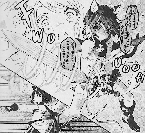 ![]() © 2020 Hinako Inoue / Yuu Tanaka DokicoEin Mann wird von einem Auto überfahren und wird in einer Fantasiewelt als Schwert wiedergeboren. Glücklicherweise beherrscht er die Telekinese, so dass er durch die Gegend fliegen kann. Eines Tages landet er allerdings in einer Zone, in der er keine Magie ausüben kann. Glücklicherweise wird er von einem versklavten Katzenmädchen gefunden. Er verbindet sich mit ihr und gibt ihr den Namen Fran. Weil er sie ausbilden will, nennt sie das Schwert nun Meister. Auch wenn Fran noch sehr jung ist und auch nur als Abenteurerin den Rang C hat, schafft sie es mit der Hilfe von Meister, auch höherklassige Monster zu besiegen. Denn Meister hat die Fähigkeit, durch das Zerstören der Kristallherzen der Monster, deren Skill zu übernehmen und an Fran weiter zu geben. Mit ihren Skills schafft es Fran auch, einen Steingolem zu besiegen, der zwei Abenteurer bedroht hat. Ihre Freundin Amanda, eine Halbelfin und auf Rang A, kommt zu spät, um ihr zu helfen. Doch auch wenn sie befreundet sind und Amanda einen höheren Rang als sie hat, übergibt ihr Fran die Abenteurer, damit sie sie in die Stadt zurückbegleitet und verschwindet. Denn Fran ist auf dem Weg zu dem Phantomdungeon. Dieser geheimnisvolle Dungeon taucht alle sechs Jahre für einen Tag aus dem Blutnebel auf, der ihn umgibt. Tatsächlich finden Fran und Meister den Dungeon. Gemeinsam mit dem beschworenen Dunkelwolf Urushi betreten sie den Dungeon und können die Monster darum besiegen. Aber dafür, dass es ein geheimnisvoller Dungeon ist, der nur alle paar Jahre auftaucht, fehlen die gefährlichen Monster. Statt dessen finden sie im Zentrum des Dungeons eine große Glocke. Als Fran die Glocke zerschlägt, weil sie darin Magiesteine vermutet, werden sie von einem gleißenden Licht umgeben. Als Fran wieder zu sich kommt, befindet sie sich außerhalb des Dungeons. An dessen Stelle befindet sich nun ein Hof. Aber auch Meister ist verschwunden. So begibt sie sich zusammen mit Urushi auf die Suche nach ihm. Als Meister wieder zu sich kommt, befindet er sich in einer Vitrine. Um ihn herum sind eine Menge Besucher, die ihn wie einen Staatsschatz bestaunt. Er fragt sich, wie er zu der Ehre kommt. Er meint, dass er sich aus der Vitrine befreien könnte. Aber dazu müssen die Besucher verschwunden sein. Doch die Besuchsschlange ist lang, denn am nächsten Tag soll die Prinzessin des Landes den Thron besteigen. Auch Fran erfährt, dass Meister ausgestellt ist. Doch als sie ihn nehmen will, wird sie verhaftet und ins Gefängnis gestorben. Es stellt sich heraus, dass Amanda die Prinzessin des Landes ist. Und sie erinnert sich nicht an Fran. Ein kleiner Vogel hilft Fran schließlich zu fliehen. Gemeinsam schaffen sie es zum Meister. Dort erklärt der Vogel plötzlich, dass er der Geist der Glocke ist. Die Glocke ist ein Wunschglocke. Durch die Zerstörung wurde ihre Magie freigesetzt, so dass eine Parallelwelt erschaffen worden ist. Um wieder in die eigene Geld zu gelangen, müssen Fran und Meister alle Splitter der Glocke finden, und sie zusammen setzen. Aber um die Splitter zu finden, müssen sie die Wünsche der Leute erfüllen, die einen der Splitter absorbiert haben. So müssen Fran und Meister in dieser Welt einen Wunsch erfüllen. Und zu ihrem Erstaunen ist der Wunsch der, dass der Nationalschatz, also Meister, auf möglichst spektakuläre Art gestohlen werden soll. Der Manga handelt von einem jungen Catgirl, das mit einem mächtigen magischen Schwert durch verschiedene Parallelwelten reisen muss, um die Scherben einer Wunschglocke einzusammeln. Die Wünsche, die sie dabei erfüllen müssen, sind dabei teilweise sehr überraschend. Sie treffen dabei auch auf einige Bekannte und Freunde, die sich aber nicht an sie erinnern. Zumal sie nun andere Rollen darstellen, als in ihrer Welt. Grafisch ist der Manga sehr gut. Die Charaktere sind sauber und detailliert getroffen und lassen sich auch in den unterschiedlichen Welten mit unterschiedlicher Kleidung leicht wiedererkennen. Die Frisuren sind sauber und detailreich gestaltet, wobei Fran als Katzenmädchen und Amanda als Halbelfe auch entsprechende Ohren haben. Auch die Gesichter sind einzigartig gezeichnet. Die Emotionen sind mit ihnen meistens gut getroffen, wobei einige Gefühle auch nur einfach gezeigt werden. Die Kleidung ist für die verschiedenen Klassen gut gewählt. Während die Abenteurer nur einfache Lederrüstungen haben, die die Figur der Frauen auch gut betont, haben die Ritter schwerere Rüstungen und die Adligen eher Gewänder und Stoffkleidungen. Die Kleidung ist meistens detailreich gestaltet und durch Schattierungen den Körpern und ihren Bewegungen angepasst. Die Bewegungen sind in dem Manga dynamisch und die Posen ausgeprägt gezeichnet. Urushi ist als Schattenwolf gut getroffen. Der Vogel aus der magischen Glocke ist allerdings etwas aufgeplustert. Auch Gegenstände, unter ihnen auch Meister, sind sauber und detailliert gezeichnet. Die Hintergründe sind ebenfalls detailreich gestaltet. |
