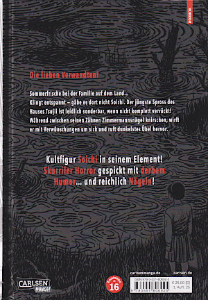 Inhalt vom Verlag: Soichi, der unheimliche zweite Sohn des Tsujii-Clans, hat ein ganz besonderes Talent: Mit langen Nägeln im Mund klappert er gespenstisch und flucht so lange, bis absurde Katastrophen eintreten. Egal ob Sommerferien oder Geburtstagsfeier – Soichi verwandelt jede Gelegenheit in ein schauriges Spektakel. Doch nicht immer läuft alles nach Plan, und manchmal trifft ihn der Schrecken selbst. Ob als Vampir, Voodoo-Meister oder boshafter Störenfried – niemand ist vor seinen dunklen Machenschaften sicher, nicht einmal seine eigene Familie! (© Carlsen Verlag) |