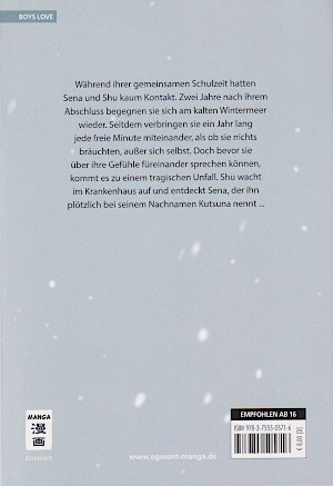 Inhalt vom Verlag: Während ihrer gemeinsamen Schulzeit hatten Sena und Shu kaum Kontakt. Zwei Jahre nach ihrem Abschluss begegnen sie sich am kalten Wintermeer wieder. Seitdem verbringen sie ein Jahr lang jede freie Minute miteinander, als ob sie nichts bräuchten, außer sich selbst. Doch bevor sie über ihre Gefühle füreinander sprechen können, kommt es zu einem tragischer Unfall. Shu wacht im Krankenhaus auf und entdeckt Sena, der ihn plötzlich bei seinem Nachnamen Kutsuna nennt ... (© Egmont Manga) |
