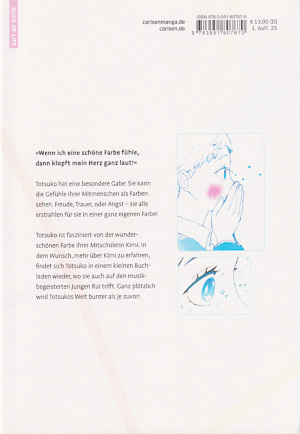 © 2024 Sanami Suzuki / Reiko Yoshida Carlsen VerlagTonko Higurashi, genannt Totsuko, kann die Welt nur in Schwarzweiß sehen. Farben sieht sie nur, wenn sie Menschen mit besonderen Gefühlen sieht. So erscheinen ihre Lehrerinnen in einem warmen Gelb und Rot. Aber besonders freut sie sich in der Schule auf die Begegnung mit ihrer Mitschülerin Kimi Sakunaga aus der Parallelklasse. Denn Kimi strahlt immer so ein ruhiges Blau aus, das Totsuko so beruhigt. Doch eines Tages ist Kimi weg, sie hat die Schule verlassen. Das stößt Totsuko in eine tiefe Depression. Weder Schwester Hiyoko, die in einem ruhigen Gelb leuchtet noch die die Waldschwestern, drei Schülerinnen, die immer in unterschiedlichen Farben leuchten, können sie trösten. So begibt sich Totsuko in der Stadt auch die Suche nach Kimi. Doch zunächst sieht nur die schwarzweißen Gebäude. Eines Tages folgt Totsuko einer Katze zu einem kleinen Buchladen. In dem Laden hört sie das Stück „Ave Maria“, dass auf einer Gitarre gespielt wird. Totsuko kennt das Stück aus der Schule und als sie ihr folgt, findet sie Kimi vor. Totsuko ist erfreut und da sie Kimi nie dabei gesehen hat, wie sie Musik spielt, beginnt sie, mit ihr über die Musik zu reden. Dann kommt ein junger Mann dazu, der in einem besonders schönen Grün leuchtet. Als er fragt, ob Kimi und Totsuko in einer Band spielen, fragt ihn Totsuko überraschen, ob er sich ihnen anschließen will. Der Manga handelt von drei jungen Menschen, die sich zufällig in der Stadt treffen. Jeder von ihnen hat sein eigenes Schicksal, deren unterschiedlichen Vorgeschichten erzählt wird. Aber nur Totsuko erkennt anhand der Farbe, wie gut sie zusammen passen. Grafisch ist der Manga sehr gelungen. Die Charaktere sind detailliert und abwechslungsreich gestaltet. Die Frisuren sind unterschiedlich gezeichnet, wobei Totsuko die einzige ist, die blonde Haare hat. Die Gesichter sind fein dargestellt und können gut die Gefühle zeigen. Die Schuluniform ist ein schlichtes Kleid mit Schleife. Doch abseits der Schule werden auch normale Straßenkleidung getragen. Die Kleidung ist dabei gut gestaltet und mit Falten und Schattierungen den Posen angepasst. Auch die Tiere und Pflanzen sind gut getroffen. Die Gegenstände wie die Gitarre oder die Notenbücher sind ordentlich gezeichnet. Die ganzen Hintergründe sind sehr sauber und detailreich dargestellt. |