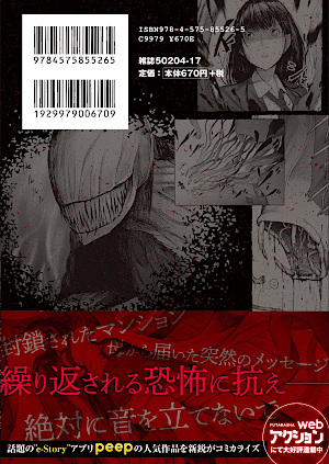 Inhalt vom Verlag: Schülerin Ryouka Tsurumi (16) wacht eines Tages auf und findet sich alleine in ihrem abgeschlossenen Apartment wieder. Sie nimmt mit ihrer sich draußen befindenden Mutter Kontakt auf und erfährt, dass auf dem Dach ein riesiges unbekanntes Lebewesen namens „X“ lauert. Es stellt sich heraus, dass Shuuhei, ein Junge aus ihrer Mittelschulzeit, sich ebenfalls im Gebäude aufhält … (© Planet Manga) |