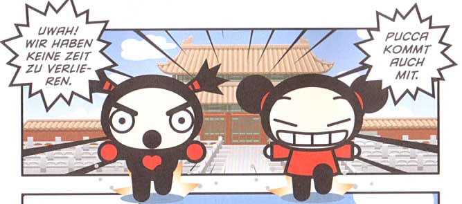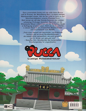 ![]() © 2004 Vooz Egmont MangaPucca ist die Lieferantin des Geo-Ryong-Restaurants. Ihr Freund ist der Ninja Garu. Er trainiert fleißig, kommt aber gegen Pucca nicht an. So wehrt er sich auch bislang erfolglos gegen ihre Annäherungsversuche. Eines Tages findet Garu in einem alten Haus ein Würfelspiel, in dem ein Geist steckt. Dieser überredet Garu, das Spiel zu spielen. Als Spielfiguren sollen Garu und Pucca, die auch mit von der Party ist, einspringen. Garu würfelt als Erster und wird in das Spiel gezogen, woraufhin Pucca hinterher springt. Gemeinsam landen sie auf der Chinesischen Mauer. Um weiter zu kommen müssen die beiden dort eine Aufgabe erfüllen. In der Zwischenzeit erzählt der Würfel die Geschichte der Chinesischen Mauer sowie Geschichten um den Bau der Mauer. Im weiteren Verlauf des Spiels müssen Pucca und Garu zu weiteren Orten in China, um dort Aufgaben auszuführen. Und immer erzählt der Würfel Geschichten dazu. "Pucca" ist eigentlich Lehrbuch für jüngere Kinder. Das merkt man sowohl Inhaltlich als auch Grafisch. Nachteilig wirkt sich dabei vor allem die Computerkolorierung aus. Es ist aber auch eine nette Geschichte für Pucca-Fans, die wissen wollen, was hinter der Figur steckt. Der höhere Preis der Manhwas erklärt sich durch die Größe und die durchgehende Farbe. |
