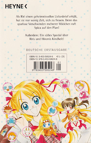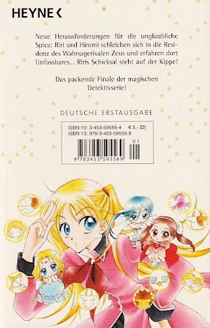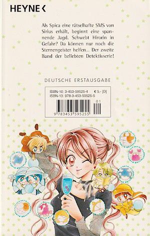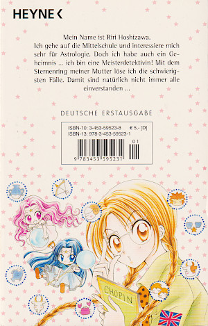 ![]() © 2001 Natsumi Ando HeyneRiri geht auf die Mittelschule und betreibt Astrologie als Hobby. Allerdings hat sie ein Geheimnis. Wie ihre Mutter vor ihr, benutzt Riri den Sternenring, um als Meisterdetektivin Spica Kriminalfälle zu lösen. Sie hofft, damit hinter das Geheimnis ihrer verschwundenen Mutter zu kommen. Da ihre wahre Identität nicht aufgedeckt werden soll, muss sie sich vor ihrem Vater in Acht nehmen. Denn der ist ausgerechnet der Kommissar, der die Kriminalfälle bei der Polizei bearbeitet. Eines Tages kommt Hiromi in die Klasse. Er ist auch fasziniert von Kriminalfällen und so stecken die beiden bald mitten in einem Fall. Eine Mitschülerin wird erhängt im Baum gefunden. Sowohl Riri als auch Hiromi bezweifeln, dass es Selbstmord war und nehmen die Ermittlungen auf. Riri verlässt sich dabei auf den Sternenring, in dem Sternengeister wohnen, die je nach Sternzeichen erscheinen. Diese sind aber sehr eigen und hinterlassen Riri immer ein paar Rätsel, die sie zur Lösung des Falls lösen muss. Der Manga lebt zum einen von den Kriminalfällen, die aber zu konstruiert wirken und von den Sternengeistern, die auf ihre Art sehr niedlich sind, aber leider zu wenig erscheinen. |